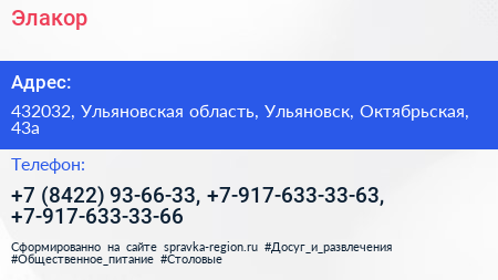 Элакор по адресу 432032, Ульяновская область, Ульяновск, Октябрьская, 43а в дальнейшем Организация, размещена в следующих категориях: