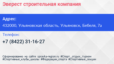 Эверест, строительная компания по адресу 432000, Ульяновская область, Ульяновск, Бебеля, 7а в дальнейшем Организация, размещена в следующих категориях: