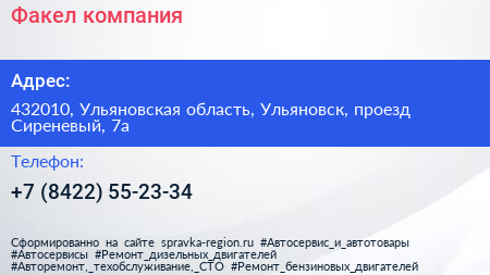 Факел, компания по адресу 432010, Ульяновская область, Ульяновск, проезд Сиреневый, 7а в дальнейшем Организация, размещена в следующих категориях: