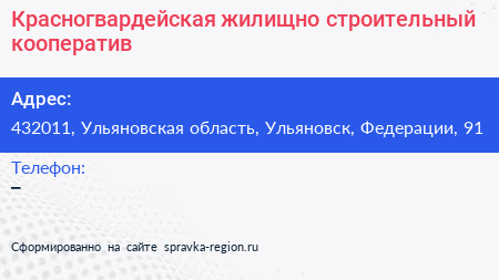 Красногвардейская, жилищно-строительный кооператив по адресу 432011, Ульяновская область, Ульяновск, Федерации, 91 в дальнейшем Организация, размещена в следующих категориях: