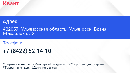 Квант по адресу 432057, Ульяновская область, Ульяновск, Врача Михайлова, 52 в дальнейшем Организация, размещена в следующих категориях:
