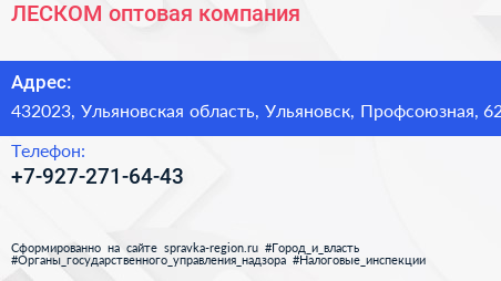 ЛЕСКОМ, оптовая компания по адресу 432023, Ульяновская область, Ульяновск, Профсоюзная, 62 в дальнейшем Организация, размещена в следующих категориях:
