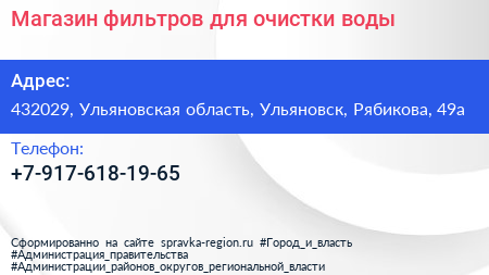 Магазин фильтров для очистки воды по адресу 432029, Ульяновская область, Ульяновск, Рябикова, 49а в дальнейшем Организация, размещена в следующих категориях: