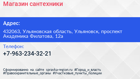 Магазин сантехники по адресу 432063, Ульяновская область, Ульяновск, проспект Академика Филатова, 12а в дальнейшем Организация, размещена в следующих категориях: