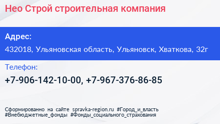 Нео Строй, строительная компания по адресу 432018, Ульяновская область, Ульяновск, Хваткова, 32г в дальнейшем Организация, размещена в следующих категориях: