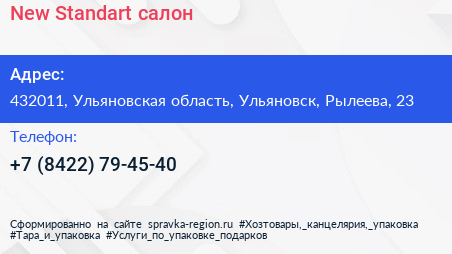 New Standart, салон по адресу 432011, Ульяновская область, Ульяновск, Рылеева, 23 в дальнейшем Организация, размещена в следующих категориях: