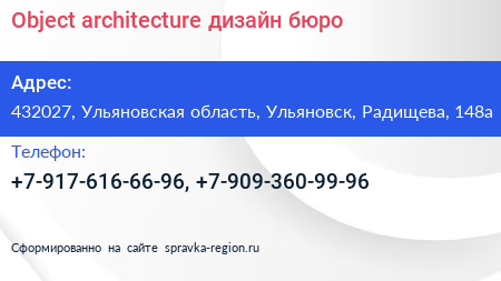 Object architecture, дизайн-бюро по адресу 432027, Ульяновская область, Ульяновск, Радищева, 148а в дальнейшем Организация, размещена в следующих категориях: