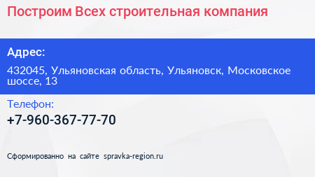 Построим Всех, строительная компания по адресу 432045, Ульяновская область, Ульяновск, Московское шоссе, 13 в дальнейшем Организация, размещена в следующих категориях: