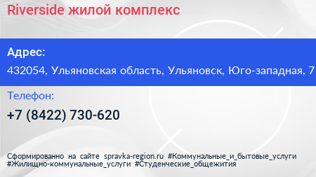 Riverside, жилой комплекс по адресу 432054, Ульяновская область, Ульяновск, Юго-западная, 7 в дальнейшем Организация, размещена в следующих категориях: