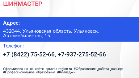 ШИНМАСТЕР по адресу 432044, Ульяновская область, Ульяновск, Автомобилистов, 15 в дальнейшем Организация, размещена в следующих категориях: