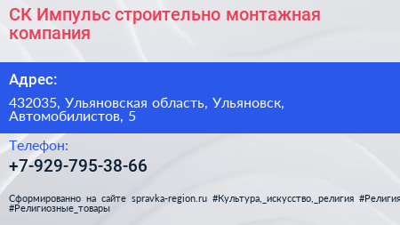 СК Импульс, строительно-монтажная компания по адресу 432035, Ульяновская область, Ульяновск, Автомобилистов, 5 в дальнейшем Организация, размещена в следующих категориях:
