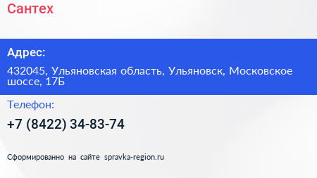 Сантех по адресу 432045, Ульяновская область, Ульяновск, Московское шоссе, 17Б в дальнейшем Организация, размещена в следующих категориях: