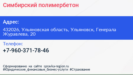 Симбирский полимербетон по адресу 432026, Ульяновская область, Ульяновск, Генерала Журавлева, 20 в дальнейшем Организация, размещена в следующих категориях: