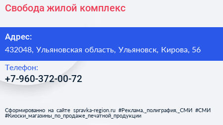 Свобода, жилой комплекс по адресу 432048, Ульяновская область, Ульяновск, Кирова, 56 в дальнейшем Организация, размещена в следующих категориях: