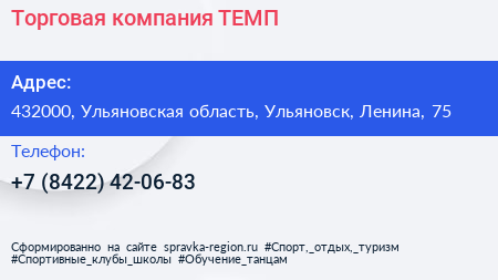 Торговая компания-ТЕМП по адресу 432000, Ульяновская область, Ульяновск, Ленина, 75 в дальнейшем Организация, размещена в следующих категориях: