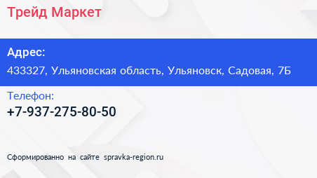 Трейд Маркет по адресу 433327, Ульяновская область, Ульяновск, Садовая, 7Б в дальнейшем Организация, размещена в следующих категориях: