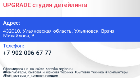UPGRADE, студия детейлинга по адресу 432010, Ульяновская область, Ульяновск, Врача Михайлова, 9 в дальнейшем Организация, размещена в следующих категориях: