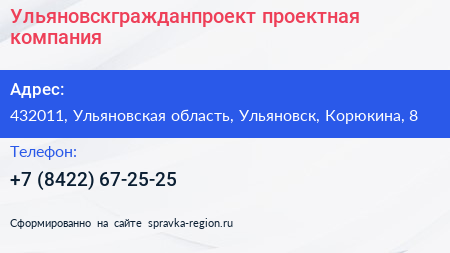 Ульяновскгражданпроект, проектная компания по адресу 432011, Ульяновская область, Ульяновск, Корюкина, 8 в дальнейшем Организация, размещена в следующих категориях: