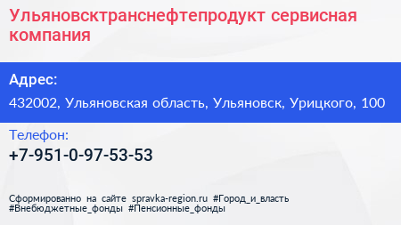 Ульяновсктранснефтепродукт, сервисная компания по адресу 432002, Ульяновская область, Ульяновск, Урицкого, 100 в дальнейшем Организация, размещена в следующих категориях: