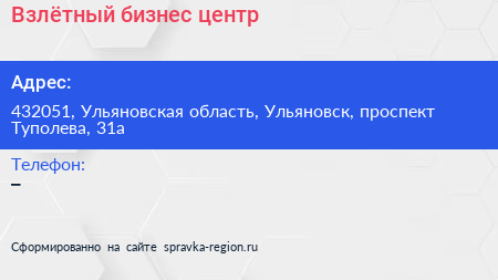Взлётный, бизнес-центр по адресу 432051, Ульяновская область, Ульяновск, проспект Туполева, 31а в дальнейшем Организация, размещена в следующих категориях: