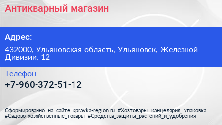 Антикварный магазин по адресу 432000, Ульяновская область, Ульяновск, Железной Дивизии, 12 в дальнейшем Организация, размещена в следующих категориях: