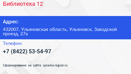 Библиотека №12 по адресу 432007, Ульяновская область, Ульяновск, Заводской проезд, 27а в дальнейшем Организация, размещена в следующих категориях: