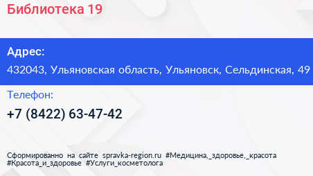 Библиотека №19 по адресу 432043, Ульяновская область, Ульяновск, Сельдинская, 49 в дальнейшем Организация, размещена в следующих категориях: