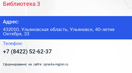 Библиотека №3 по адресу 432010, Ульяновская область, Ульяновск, 40-летия Октября, 33 в дальнейшем Организация, размещена в следующих категориях: