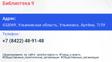 Библиотека №9 по адресу 432049, Ульяновская область, Ульяновск, Артёма, 7/59 в дальнейшем Организация, размещена в следующих категориях: