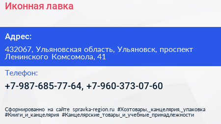 Иконная лавка по адресу 432067, Ульяновская область, Ульяновск, проспект Ленинского Комсомола, 41 в дальнейшем Организация, размещена в следующих категориях:
