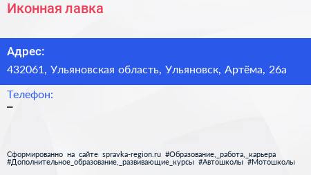 Иконная лавка по адресу 432061, Ульяновская область, Ульяновск, Артёма, 26а в дальнейшем Организация, размещена в следующих категориях: