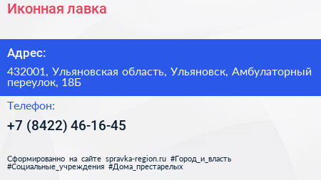 Иконная лавка по адресу 432001, Ульяновская область, Ульяновск, Амбулаторный переулок, 18Б в дальнейшем Организация, размещена в следующих категориях: