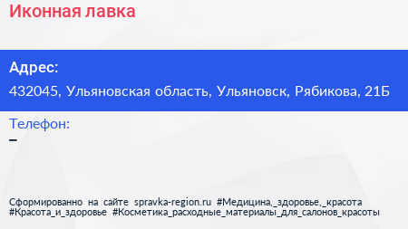 Иконная лавка по адресу 432045, Ульяновская область, Ульяновск, Рябикова, 21Б в дальнейшем Организация, размещена в следующих категориях: