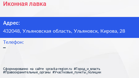 Иконная лавка по адресу 432048, Ульяновская область, Ульяновск, Кирова, 28 в дальнейшем Организация, размещена в следующих категориях: