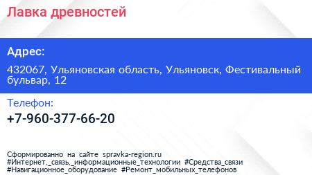 Лавка древностей по адресу 432067, Ульяновская область, Ульяновск, Фестивальный бульвар, 12 в дальнейшем Организация, размещена в следующих категориях: