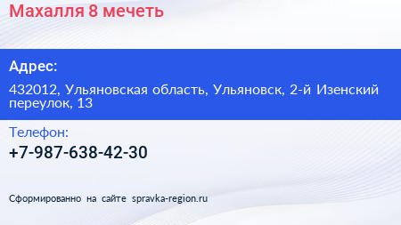 Махалля №8, мечеть по адресу 432012, Ульяновская область, Ульяновск, 2-й Изенский переулок, 13 в дальнейшем Организация, размещена в следующих категориях: