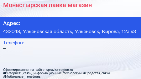 Монастырская лавка, магазин по адресу 432048, Ульяновская область, Ульяновск, Кирова, 12а к3 в дальнейшем Организация, размещена в следующих категориях: