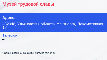Музей трудовой славы по адресу 432048, Ульяновская область, Ульяновск, Локомотивная, 17 в дальнейшем Организация, размещена в следующих категориях:
