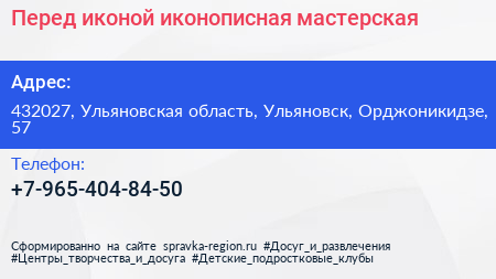 Перед иконой, иконописная мастерская по адресу 432027, Ульяновская область, Ульяновск, Орджоникидзе, 57 в дальнейшем Организация, размещена в следующих категориях: