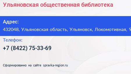 Ульяновская общественная библиотека по адресу 432048, Ульяновская область, Ульяновск, Локомотивная, 9 в дальнейшем Организация, размещена в следующих категориях: