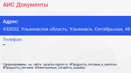 АИС-Документы по адресу 432032, Ульяновская область, Ульяновск, Октябрьская, 48 в дальнейшем Организация, размещена в следующих категориях: