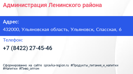 Администрация Ленинского района по адресу 432000, Ульяновская область, Ульяновск, Спасская, 6 в дальнейшем Организация, размещена в следующих категориях: