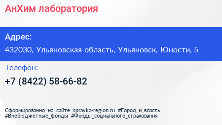 АнХим, лаборатория по адресу 432030, Ульяновская область, Ульяновск, Юности, 5 в дальнейшем Организация, размещена в следующих категориях: