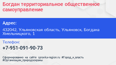 Богдан, территориальное общественное самоуправление по адресу 432042, Ульяновская область, Ульяновск, Богдана Хмельницкого, 1 в дальнейшем Организация, размещена в следующих категориях: