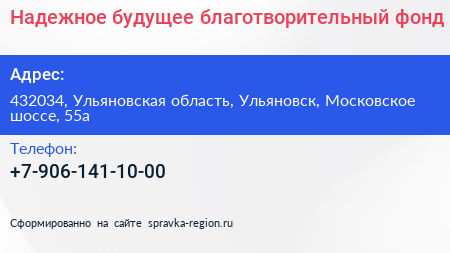 Надежное будущее, благотворительный фонд по адресу 432034, Ульяновская область, Ульяновск, Московское шоссе, 55а в дальнейшем Организация, размещена в следующих категориях: