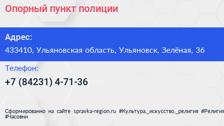 Опорный пункт полиции по адресу 433410, Ульяновская область, Ульяновск, Зелёная, 36 в дальнейшем Организация, размещена в следующих категориях: