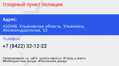 Опорный пункт полиции по адресу 432048, Ульяновская область, Ульяновск, Железнодорожная, 13 в дальнейшем Организация, размещена в следующих категориях: