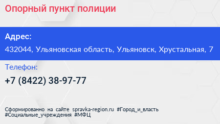 Опорный пункт полиции по адресу 432044, Ульяновская область, Ульяновск, Хрустальная, 7 в дальнейшем Организация, размещена в следующих категориях: