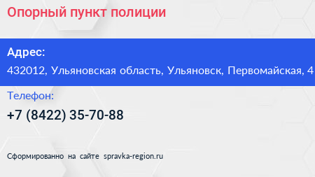Опорный пункт полиции по адресу 432012, Ульяновская область, Ульяновск, Первомайская, 4 в дальнейшем Организация, размещена в следующих категориях: