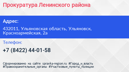 Прокуратура Ленинского района по адресу 432011, Ульяновская область, Ульяновск, Красноармейская, 2а в дальнейшем Организация, размещена в следующих категориях: